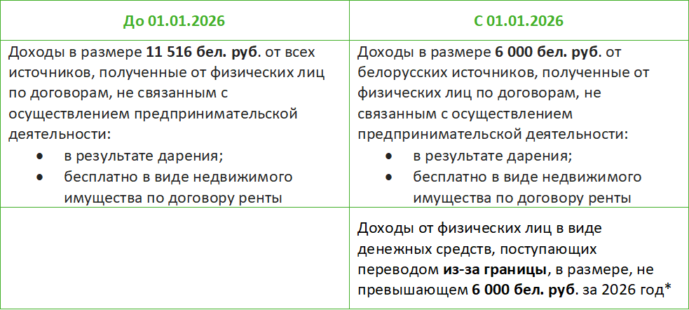 - В настоящее время налогоплательщики имеют право на льготу в отношении доходов, полученных от физических лиц в результате дарения либо бесплатно в виде недвижимого имущества по договору ренты. С 1 января 2026 года предусмотрены следующие изменения:
